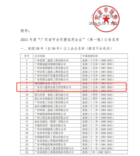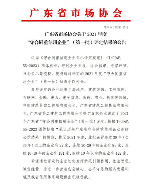 近日,廣東省市場協會發布了2021年度“守合同重信用企業”(第一批)評定結果,公司榮耀再續,連續三十“廣東省守合同重信用企業”稱號獲得榮譽,不僅對公司實力的認可,更是對誠信經營和優質服務的肯定。